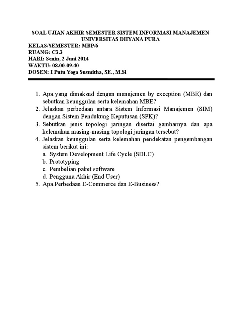 Soal ujian sistem informasi manajemen ini dibutuhkan oleh jurusan teknik informatika s1. Dengan adanya soal latihan ini semoga bisa sebagai bahan pembelajaran dan latihan sebelum menghadapi ujian. Download soal ut ekma4434 sistem informasi manajemen. Savesave latihan soal sistem informasi manajemen (sim) for later. Sistem informasi manajemen merupakan sistem informasi yang menghasilkan hasil keluaran (output) dengan menggunakan masukan (input) dan berbagai proses yang diperlukan untuk memenuhi tujuan tertentu dalam suatu kegiatan manajemen.
