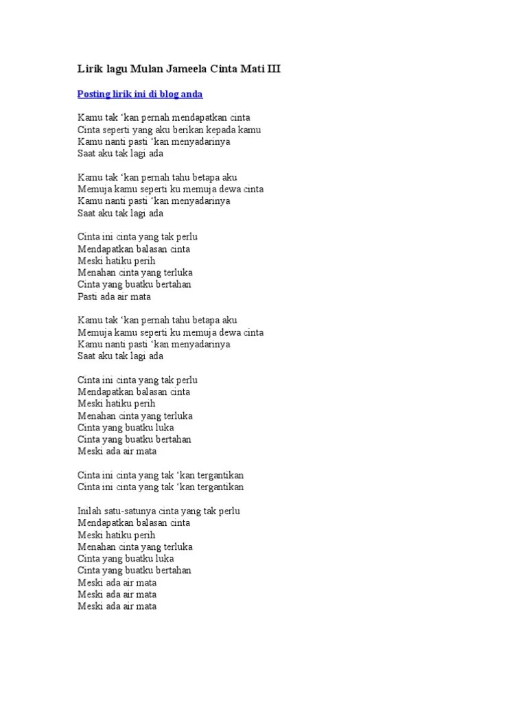Bagaimana caranya untuk agar kau mengerti bahwa aku rindu? Ahmad dhani), mungkin ini adalah lirik lagu kesukaan anda bukan? Simak lirik lagu batak cintaki cinta mati. Sayang ee sa sayang ko sekali sayang ee sa pu jantung hati dengan ko sa pu cinta mati Cinta mati harus dijaga sampai mati.